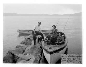Crater Lake--Cleetwood rowboat, 2 women with fishing poles, man, \"Lunch Trips\" sign