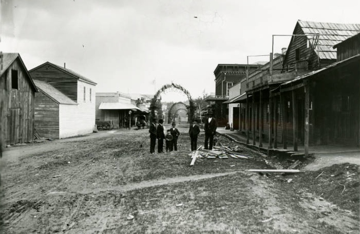 Jacksonville, Oregon Store, 3 arbors over street, Charity, Friendship, and Freedom; 8x10 wet Britt glass plate negative (link to an SOU Britt Collection photo appears to match)