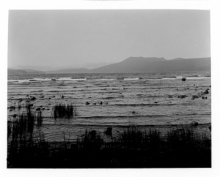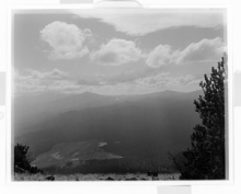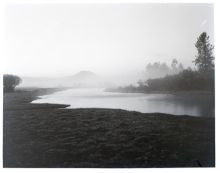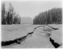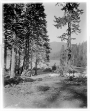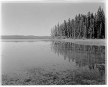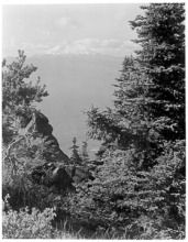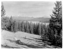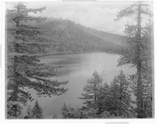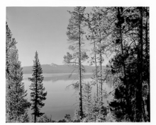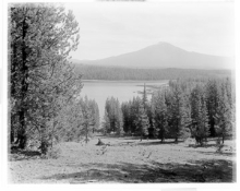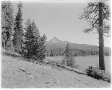 Unlabeled. Trees, possibly a lake, mountain in the distance