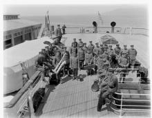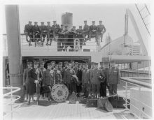People on deck of a ferry or ship, on river or inlet - land in background. Passenger ship on the Columbia River near the Interstate Bridge (Portland to Vancouver).
