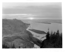 Sunset from Crown Point, Columbia River Highway, with clearcuts and railroad line visible.