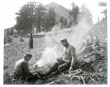 Mountain climbers sitting in field (foreground) just off the Crater Lake Rim Road, with Mount Scott in the background.
