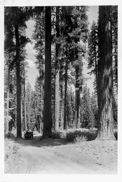 Crater Lake Highway circa 1915, model T, thick trees, driver. Shows approximate width of the Fort Klamath - Rogue River Wagon Road, likely from the south and east side.