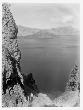Crater Lake circa 1915. Hikers on the Lake Trail in Eagle Cove.