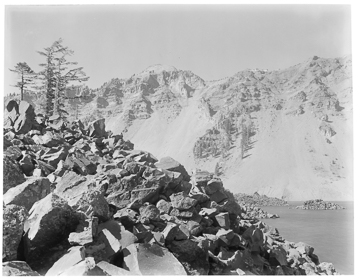 Crater Lake circa 1915. Looking toward the Watchman Slide from Wizard Island, showing a portion of Skell Channel.