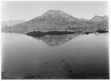 Crater Lake circa 1915 and Wizard Island. Shows the western extent of the island, which is situated on a \"platform.\" This view shows a portion of Skell Channel looking east from the shore.