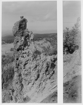 Rock Spire, Crater Lake Lodge (site of Rim Village) circa 1915, looking west from Garfield Peak. The spire is composed of welded tuff from the climactic eruption of Mount Mazama.