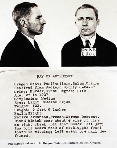 The young DeAutremont brothers and especially Ray felt they were born into a family that had been victimized by a corrupt society. It seemed only fair they follow a course of crime rather than work for a living. Studying opportunities, they decided to be train robbers and selected as their first target the southbound Southern Pacific Train No. 13, the San Francisco Express. Ray had heard rumors that on October 11, 1923, the train would carry a heavy shipment of gold, to be used in meeting payrolls. Also attractive was the railroad's requirement to stop and test brake systems at rail line summits. Train No. 13 had to test its brakes at the tiny train station of Siskiyou near the entrance of long Tunnel No. 13. A bad omen in the numbers! Roy and Hugh swung aboard the slow-moving train and ordered the engine crew to stop. When the mail clerk refused to open the mail car's door, the DeAutremonts blew it open with dynamite. Using far too much, they incinerated the car and mail clerk inside. There was nothing of much value in the car. Not sure what to do next, the brothers decided to kill the 4 trainmen who could identify them - engineer Syd Bates, fireman Marvin Seng, brakeman Charles Coyl Johnson and mail clerk Elvyn Dougherty. The assassinations were quick and brutal. The killers realized all was lost and headed for the Siskiyou woods to hide for several days and avoid posses. Traveling at night and staying out of site, the three snuck out of the Siskiyous and into northern California where they separated and went their own ways to avoid suspicion. What followed with wanted circulars posted around the world was probably the most intense manhunt ever. The posters were effective: Hugh was detected and arrested while serving in the army in the Philippines in February 1927. Ray and Roy reunited and traveled to Ohio where they adopted aliases Elmer (Ray) and Clarance Goodwin. Ray married 17-year-old Hazel to add to his disguise. Again, wanted posters did their job, and the twins were captured in Steubenville OH in March 1927 and extradited to Jacksonville OR where Hugh was now being tried on four counts of murder and several of interfering with a mail train. Heinous crime these capital murders were, public sentiment of string 'em up! was moderating, and prosecution and defense began bargaining to spare Hugh's life. Agreement was reached just about the time the twins reached Jacksonville from Steubenville - if Hugh would confess, the penalty would be life in prison, not death. Eager to save their lives, Ray and Roy sought this same deal. On June 24, 1927, the three murderous DeAutremonts were manacled and taken by train to the Oregon State Penitentiary in Salem. To be nearer her boys, mother Belle sold her store and home in New Mexico and bought a boarding house in Salem, just down the street from the penitentiary. In the pen, Hugh and Ray made the best of life and gained respect from many inside and outside prison walls. Hugh learned the printing arts, took correspondence courses from the University of Oregon in Eugene and edited and published the penitentiary newsletter Shadows. Through interesting dealings, he was paroled in 1958 and preparing to meet a fiancé who had worked with him in printing for years. Smoking and cancer caught up with him: he died in the San Francisco veterans' hospital just weeks after leaving prison walls. Roy did not adjust well to prison life. At first, he returned to barbering, his profession of youth, but then he became combative and a danger to his cell mate Ray and to others. He was admitted to the Oregon State Mental Hospital and given a frontal lobotomy in (1949). The procedure was not as successful as hoped - he calmed right down but became pretty much a vegetable. No longer a threat, he was paroled in 1983 and moved to a foster care home. He died in 1983. Ray, usually regarded the ringleader of the DeAutremont criminals, was paroled in 1958 and lived - arguably - a contributory life thereafter. The moral to the story? Ray argued that life is predestined. As much as he might regret his ghastly crime, fate prevented his living any other way. Many argue that there is no predestination - we all have alternatives to select and choices to make. Brother Verne and half-brother Charles (Chuck) lived successful, contributory lives. Even the DeAutrements' name suggests this: in French, it means the other mountain.