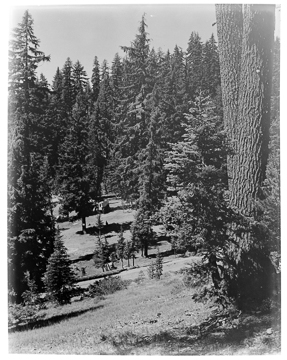 Thick forest, covered wagon, wide. Looking east with view of road segment near Crater Lake National Park Headquarters at Annie Spring.