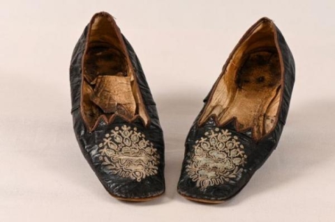 These well worn delicate slip on shoes are made of leather with embroidered tops owned and worn by Sarah Jane Miller, wife of David Miller of Jacksonville, Oregon. Notice the split leather sole allowed the cobbler to extend the width of each shoe according to the desired size.