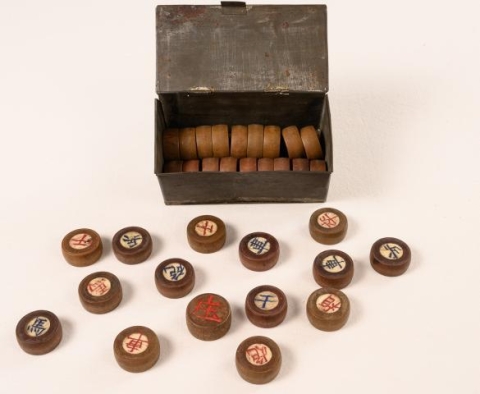 Chinese Wooden Chess Pieces in Tin Box