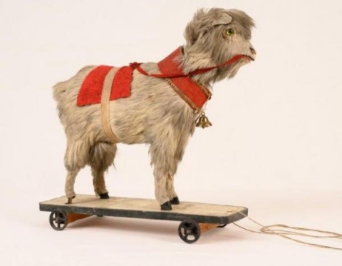 This wonderful goat pull toy has a red felt yoke with gold trim and a bell hanging from a string around its neck. A red felt blanket is secured with a tan colored strap. This toy makes a sound when the head is pulled down with the red reins. The goat stands on a wooden base with wheels with a string attached to pull the toy which dates to the late 1800s.