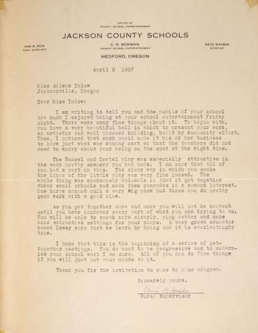 Commendation Letter from Rural Supervisor 1937 encouraging continued ‘modernization’ of teaching methods.