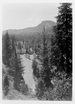 Mtn road to cabins, above Annie Spring with Camp Arant; Arant Point in distance, Crater Lake National Park