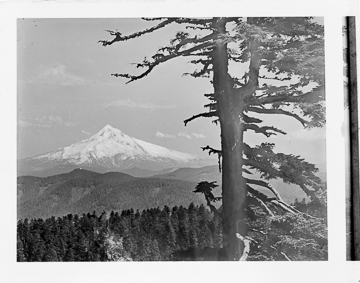 Tree in foreground, snow-cover peak (McLoughlin?) in background