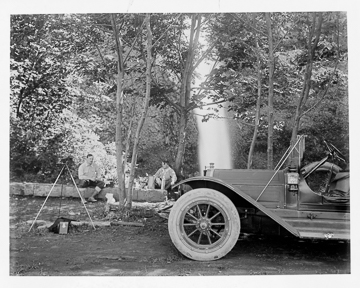 Two men seated, tripod, car, waterfall in background. Early camp along the Columbia River Highway, probably at Eagle Creek (the first USFS campground).