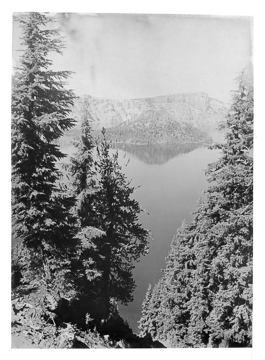 Crater Lake circa 1915 through trees, island reflection. Location is on the Rim Road, not far from Discovery Point.