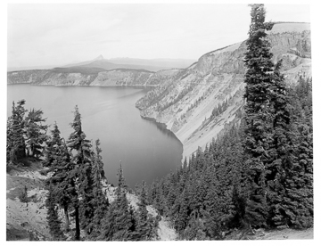 Crater Lake circa 1915. Location is the Sentinel Rock Trail from the Rim Road with Cloudcap to the right, Mt. Thielsen in the distance.