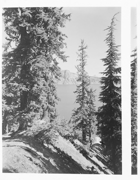 Crater Lake vista circa 1915, closeup tree, lake and cliffs. From the Lake Trail below Rim Village. Portion of Llao Rock in the distance.