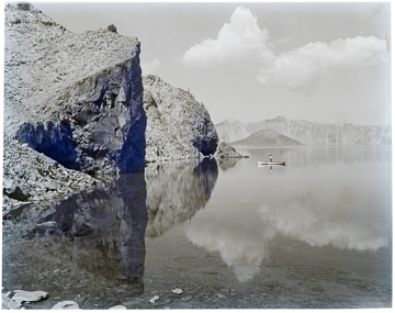 Crater Lake circa 1915, man in boat. Photo taken near Phantom Ship. looking northwest. Watchman and Hillman Peak in the distance.