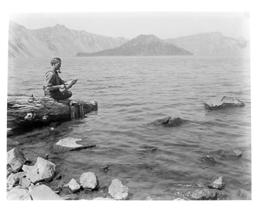 Man cleaning fish, Crater Lake circa 1915. Location was near the boat landing on south shore of lake.