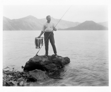 Man w/fish at Crater Lake circa 1915. Location is near the dock on the south shore of lake at the boat landing; Wizard Island in the distance.