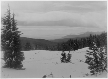 Crater Lake Trees circa 1915, early season snowfall in subalpine forest.