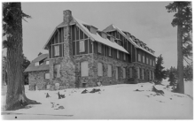 Crater Lake circa 1915 with snow. This site is part of Rim Village, near where many winter visitors stand.