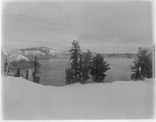 Crater Lake circa 1915 with snow, the trees are where the Kiser Studio is today, just above Victor Rock (where the Sinnott Memorial is).