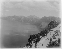 Crater Lake circa 1915, Wizard Island, snow, as viewed from Rim Village.