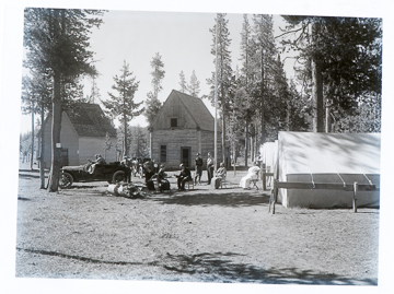 Cabins, tents, old cars, portion of Camp Arant at Annie Spring, Crater Lake National Park Headquarters at that time.