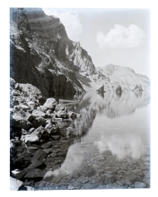 Crater Lake circa 1915, man and boat. View from lakeshore below Kerr Notch looking west toward the Phantom Ship and Applegate Peak.