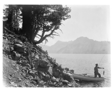 Man cleaning fish, Crater Lake circa 1915. Location was near the boat landing on south shore of lake.