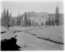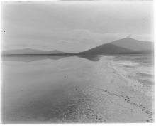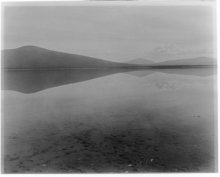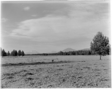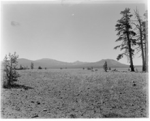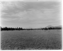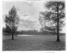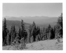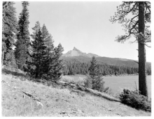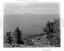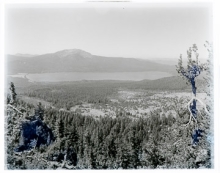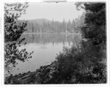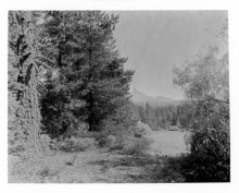 Unlabeled. Trees, possibly a lake, mountain in the distance