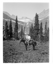 Glacier National Park--Many Glacier Camp, Mrs. Eaton on Horseback at Grinnell Lake