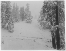 Crater Lake Trees circa 1915, early season snowfall in subalpine forest.