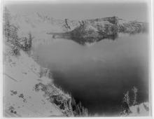 Crater Lake circa 1915 after early-season snowfall, with the area of Rim Village above the lake.