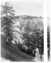 Crater Lake Lodge circa 1915. View from a spot on the old Lake Trail leading to the shoreline.
