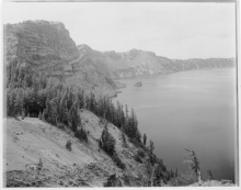 Crater Lake circa 1915, Phantom Ship from rim. Possibly taken from Dyar Rock.