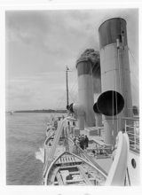 Ship smokestacks and lifeboats; passenger vessel on the Columbia River.