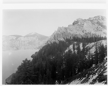Crater Lake circa 1915, remnants of autumn snow at Rim Village, looking east.