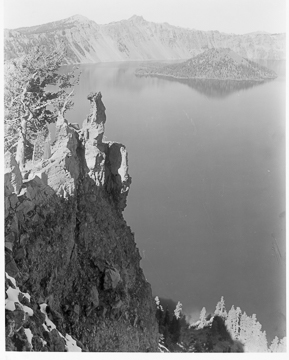 Crater Lake circa 1915, Wizard Island taken from the west rim of the caldera, showing spire and whitebark pine.