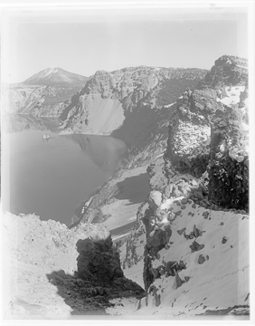 Crater Lake circa 1915, taken from the area of Dyar Rock, with portions of Applegate Peak, Dutton Ridge, Phantom Ship and Mount Scott visible.
