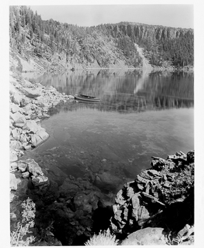 Crater Lake circa 1915, boat at Palisade Point with portions of Wineglass and the Palisades visible.