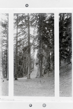 Mtn road through big trees; view looking south toward Annie Spring and Crater Lake National Park Headquarters.