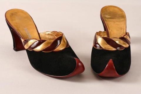 Mary Hanley wore these elegant black velvet and red heeled mules. The upturned toes are a romantic1940s nod to Jutti sytle slippers worn by wealthy women during the Mughal Empire.