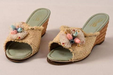 Designer Salvatore Ferragamo popularized the cork wedge in the 1930s. The scarcity of raw materials in Italy during the Facist Regime from1922-1943 inspired him to experiment with cork. These Tintoretto sandals were made in Florence, Italy.