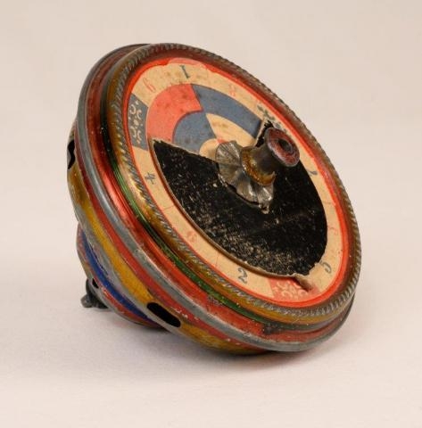 This well used and well-loved metal top was sent spinning when the pin at the bottom was placed on a hard surface and ‘pumped’ up and down using the knob on the flat top for hours of fun.