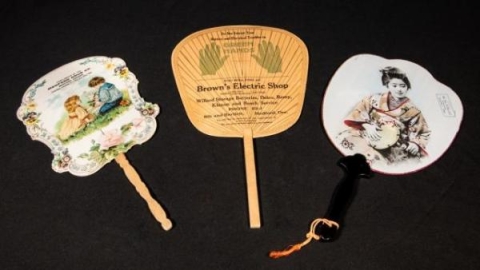 SOHS# 1986.1.697 This gray silk fan is attached to a black lacquered handle. A tinted photograph depicts a Japanese woman dressed in traditional clothing with "Compliments of R. H. O'Neill The Housefurnisher”, Grants Pass, Oregon" printed on the front.