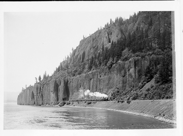 Lake, railroad track, train, cliff with tunnel, possibly on Washington side of the Columbia River.